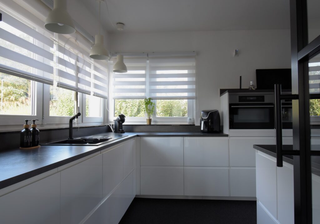 inductie kooplaat met ingebouwde afzuiging, koelkast, stoomoven, combi oven en vaatwasser.