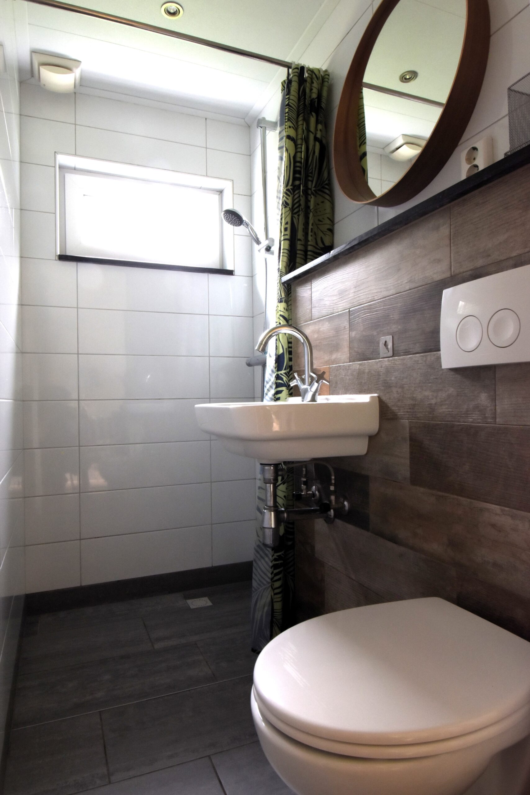 De badkamer, 2.08 x 1.25 is v.v. een inloopdouche, vaste wastafel en zwevend toilet.