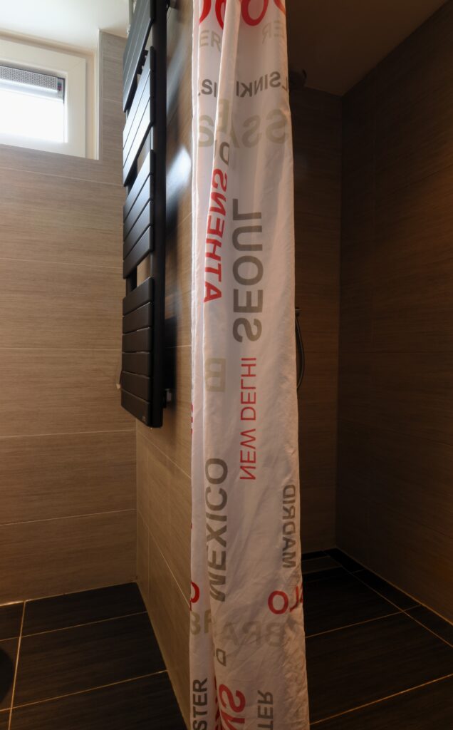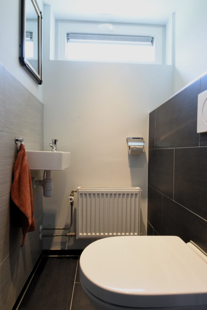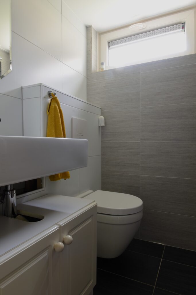 De moderne badkamer, 2.04 x 1.56 is v.v. een inloopdouche, zwevend toilet en wastafel.