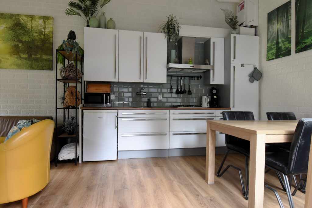 De luxe keuken is v.v. de volgende apparatuur: Gastoestel, afzuigkap, combimagnetron, koelkast, waterkoker en Senseo koffie apparaat.
