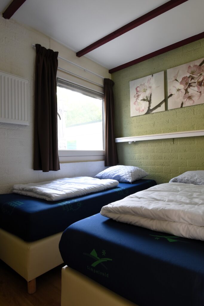 De 2 slaapkamers, resp. groot, 2.95 x 2.00 en 2.90 x 2.00, zijn v.v. van twee 1 persoons boxsprings matrassen en kleerkast. Beide slaapkamers zijn v.v. horren.