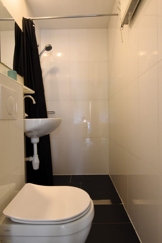 De badkamer, 2.07 x 1.07 is v.v. een inloopdouche, zwevend toilet en vaste wastafel.