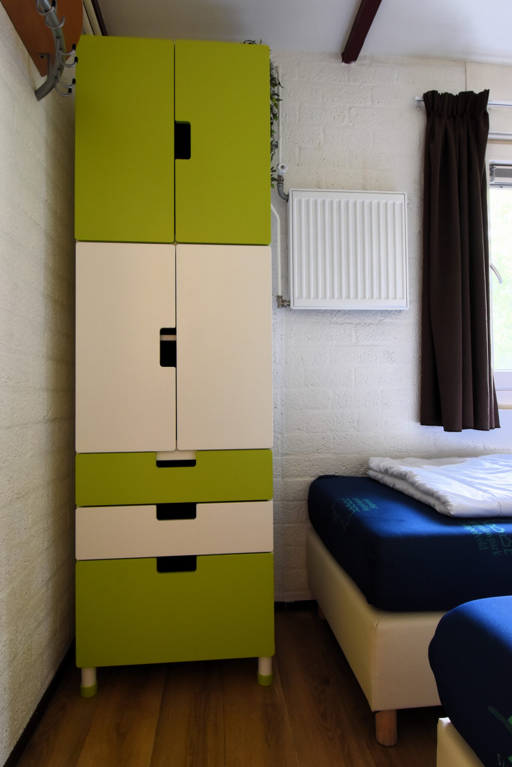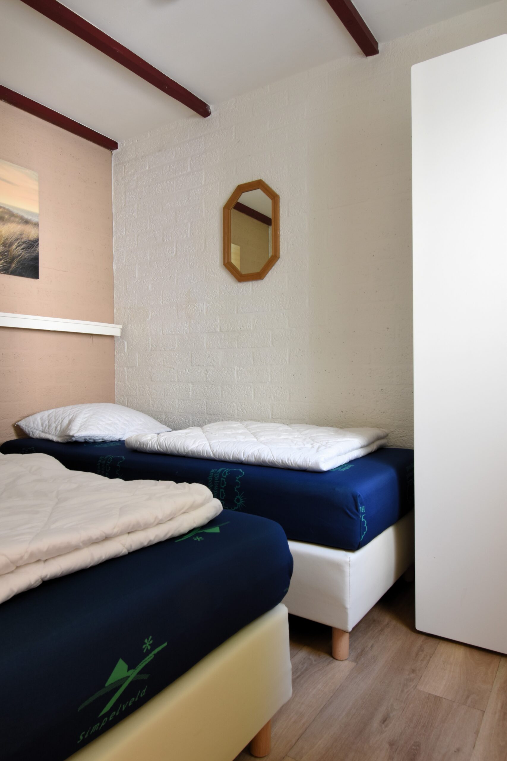 De 2 slaapkamers, resp. groot, 2.95 x 2.00 en 2.90 x 2.00, zijn v.v. van twee 1 persoons boxsprings matrassen en kleerkast. Beide slaapkamers zijn v.v. horren.