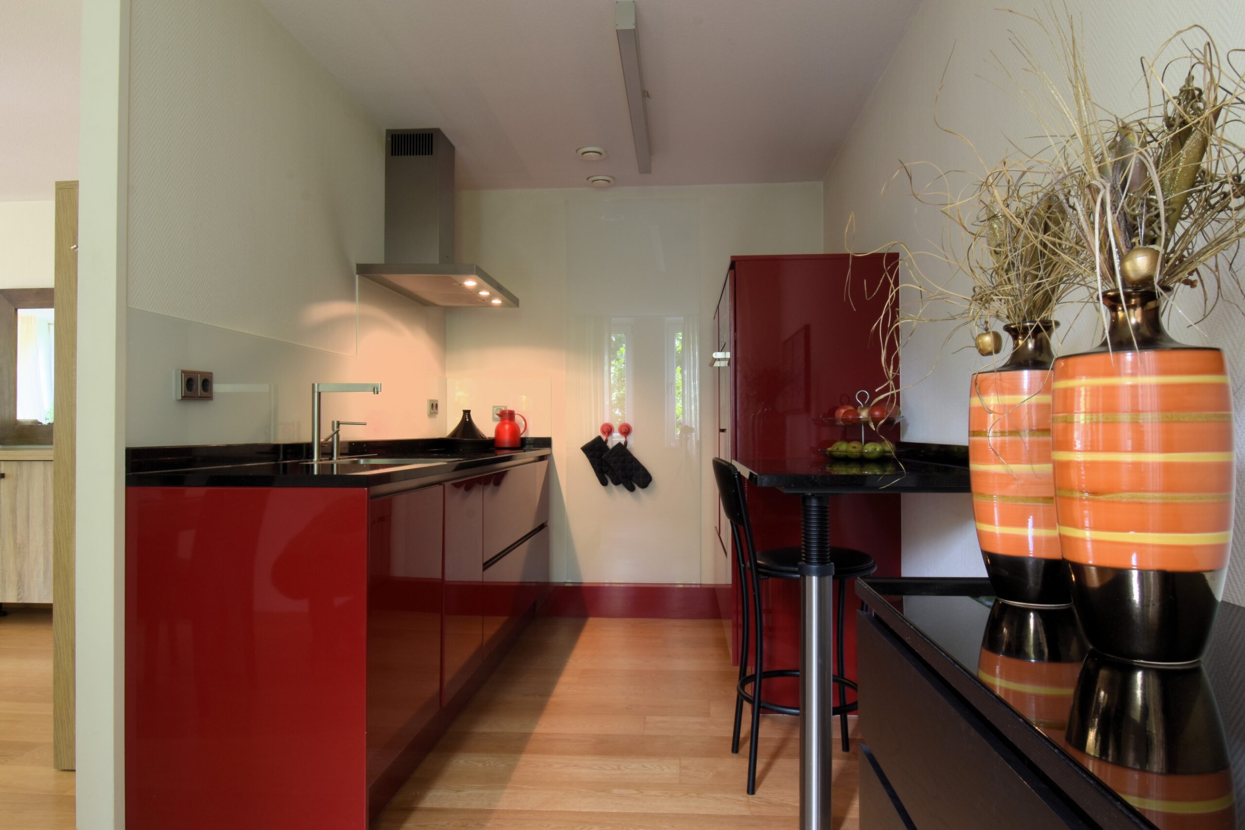 Keramische kookplaat, afzuigkap, koelkast, oven en vaatwasser.