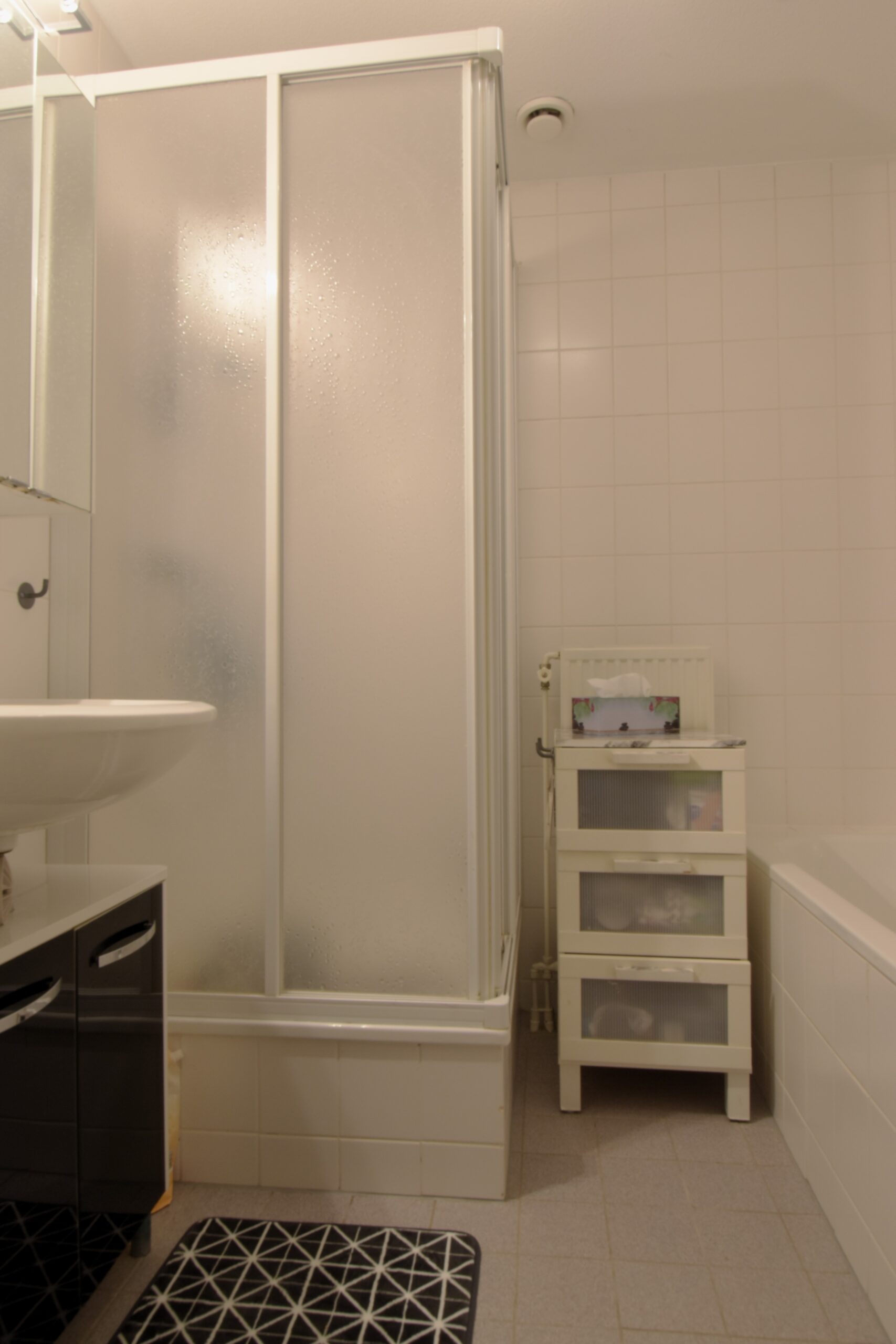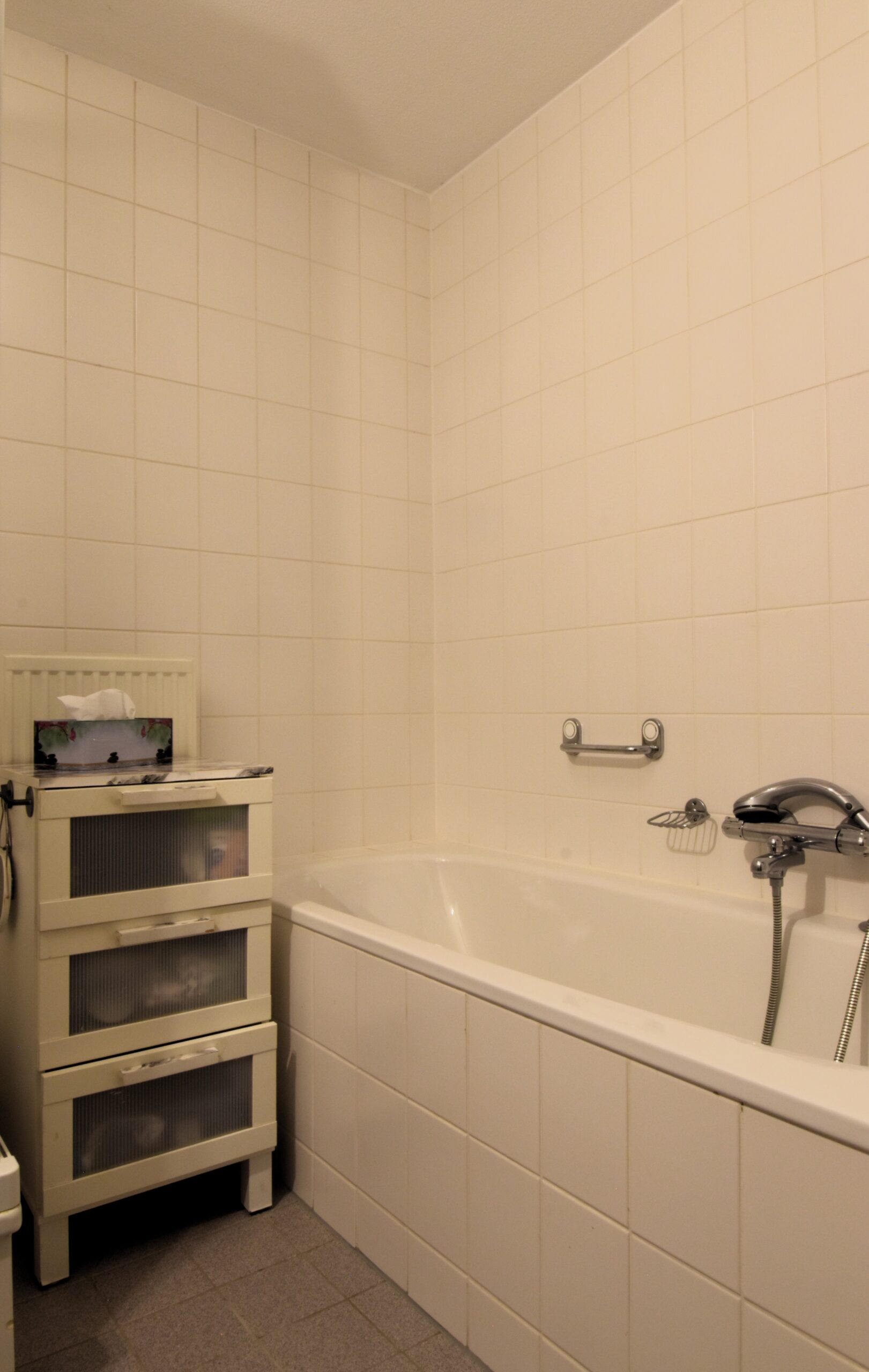 De badkamer, 2.18 x 1.90 is v.v. en ligbad, separate douche en vaste wastafel.